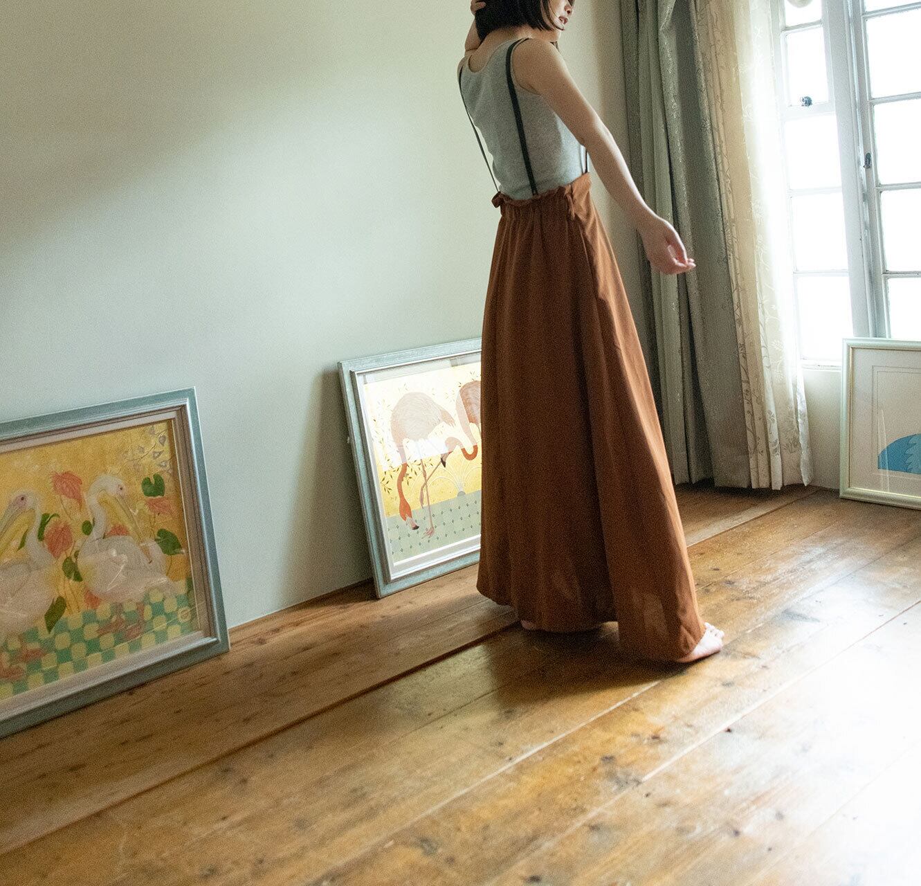 エコレザーのサスペンダーが取り外し可能なこちらのスカート✯ こっくりカラーが秋の予感✯ ■素材・成分:素材: 【表地】 ポリエステル100% 【裏地】 ポリエステル100% 【サスペンダー】 合成皮革 ---------- モデル身長:157cm 6834740S5