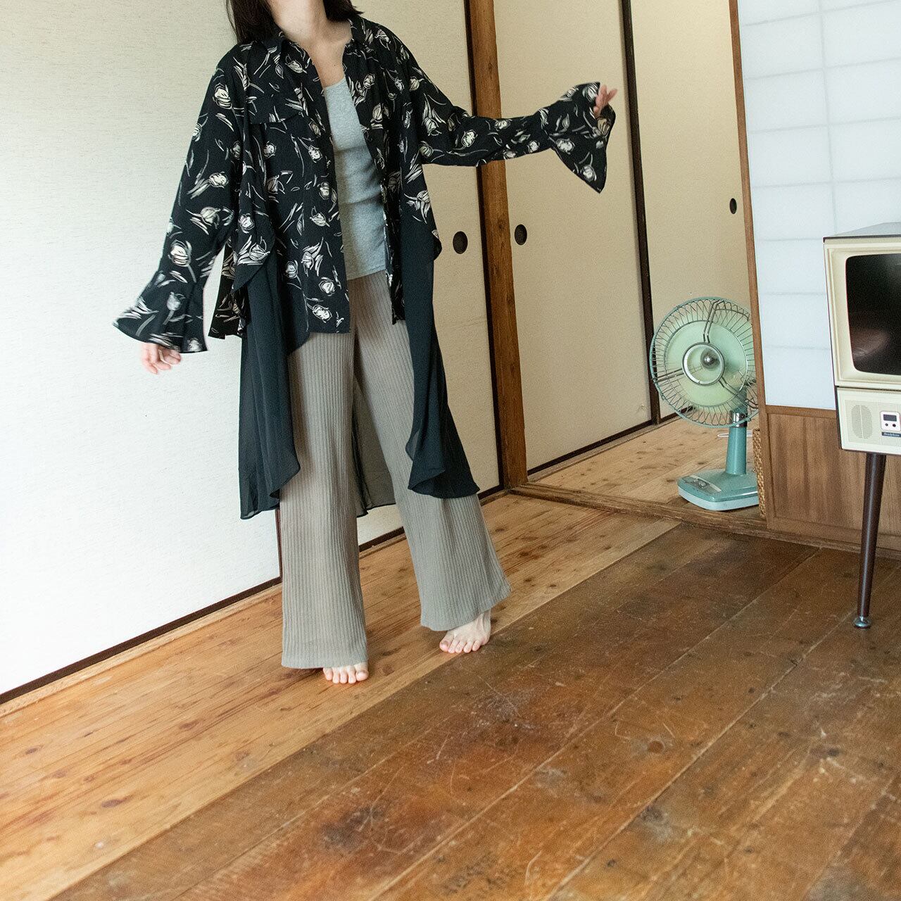 羽織りにもシャツチュニックとしても使えるアイテム✯ 袖や裾のひらひら感が風に揺れて軽やかな印象に! ■素材・成分:柄部分 ポリエステル100% 無地部分 ポリエステル100% ---------- モデル身長:157cm 8084456S2