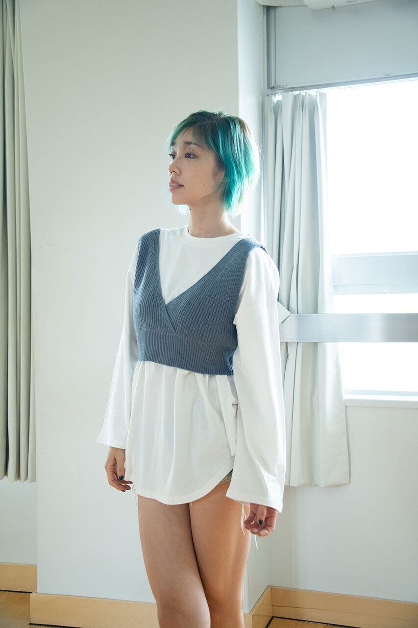 取り外しができるニットビスチェ付きのカットソー✯ どちらも他のお手持ちのアイテムと組み合わせられるので、考えるのもたのしいです✯ カラーはブルーとブラックの2色♪ ■素材・成分:ビスチェ:アクリル 100% インナー:綿 100% ---------- モデル身長:167cm 8396067S2