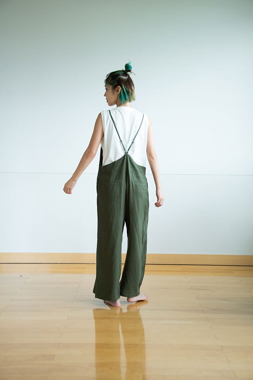 麻混の涼しいサロペット✯ 晩夏〜秋にむけて使えるカーキのお色も使いやすいです♪ ■素材・成分:素材:レーヨン 70% 麻 30 % ---------- モデル身長:167cm 6208260S5